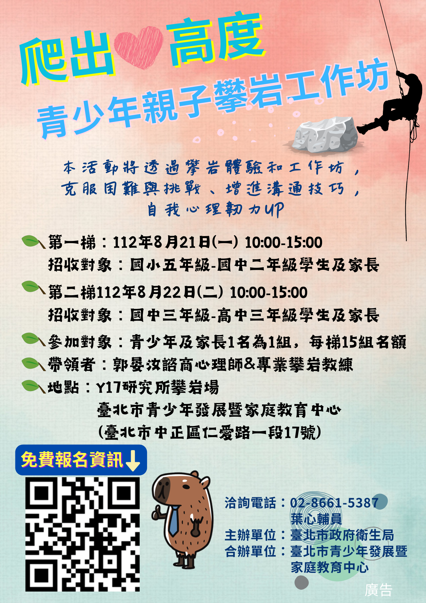 對於攀岩有興趣的五年級以上的孩子,在暑假有體驗的機會囉~詳情請見附件!