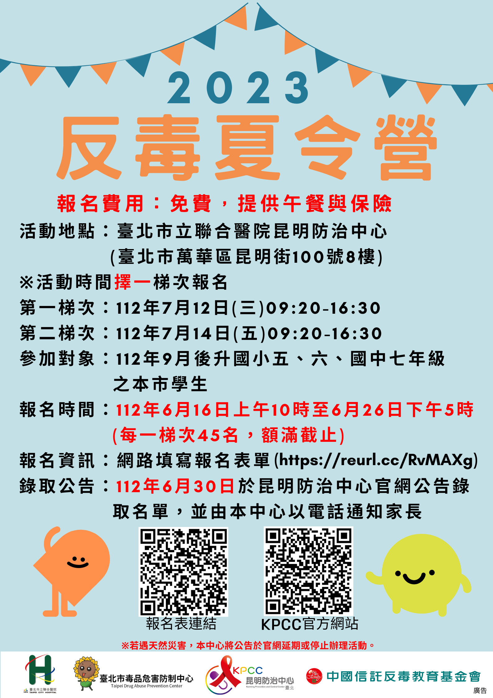 三、檢附營隊宣傳海報1份,惠請協助公告宣傳,報名資訊可至 昆明防治中心官網查詢(https://tpech.gov.taipei /mp109231)。 四、本中心活動承辦人:楊立勤社工師,連絡電話02-23703739 分機1470。