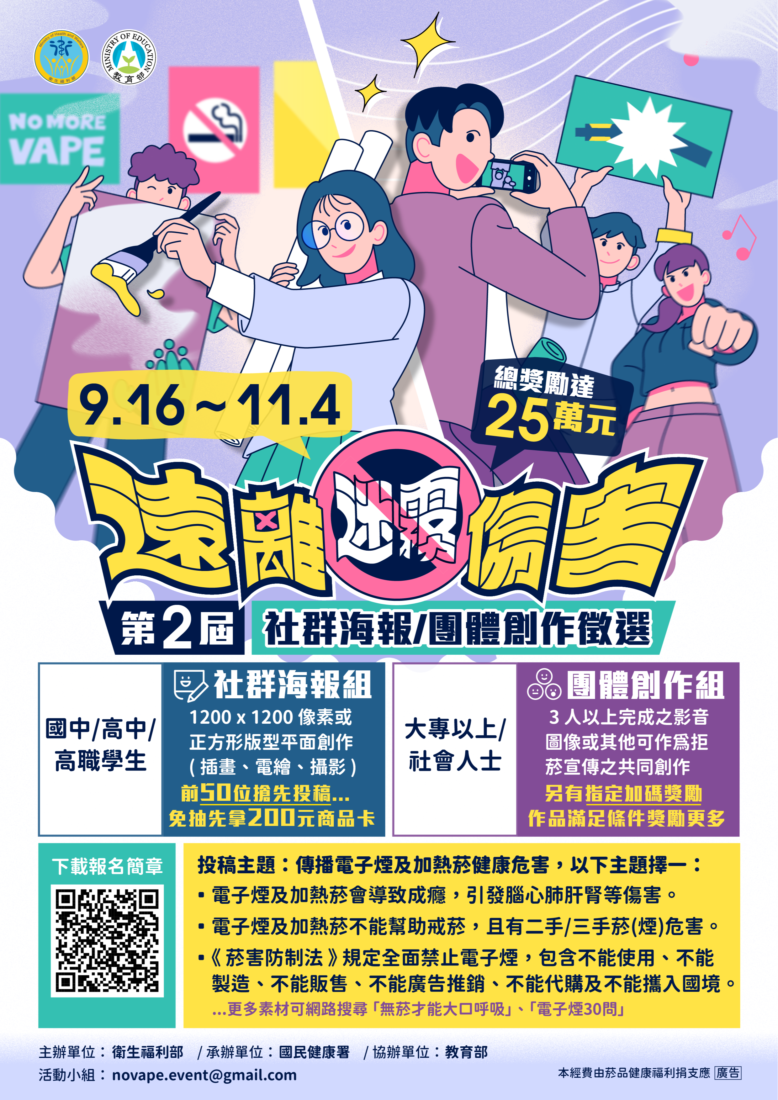 1、社群海報組:具中華民國國籍並在中華民國設籍,現正就讀國中/高中/高職學生皆可參加。