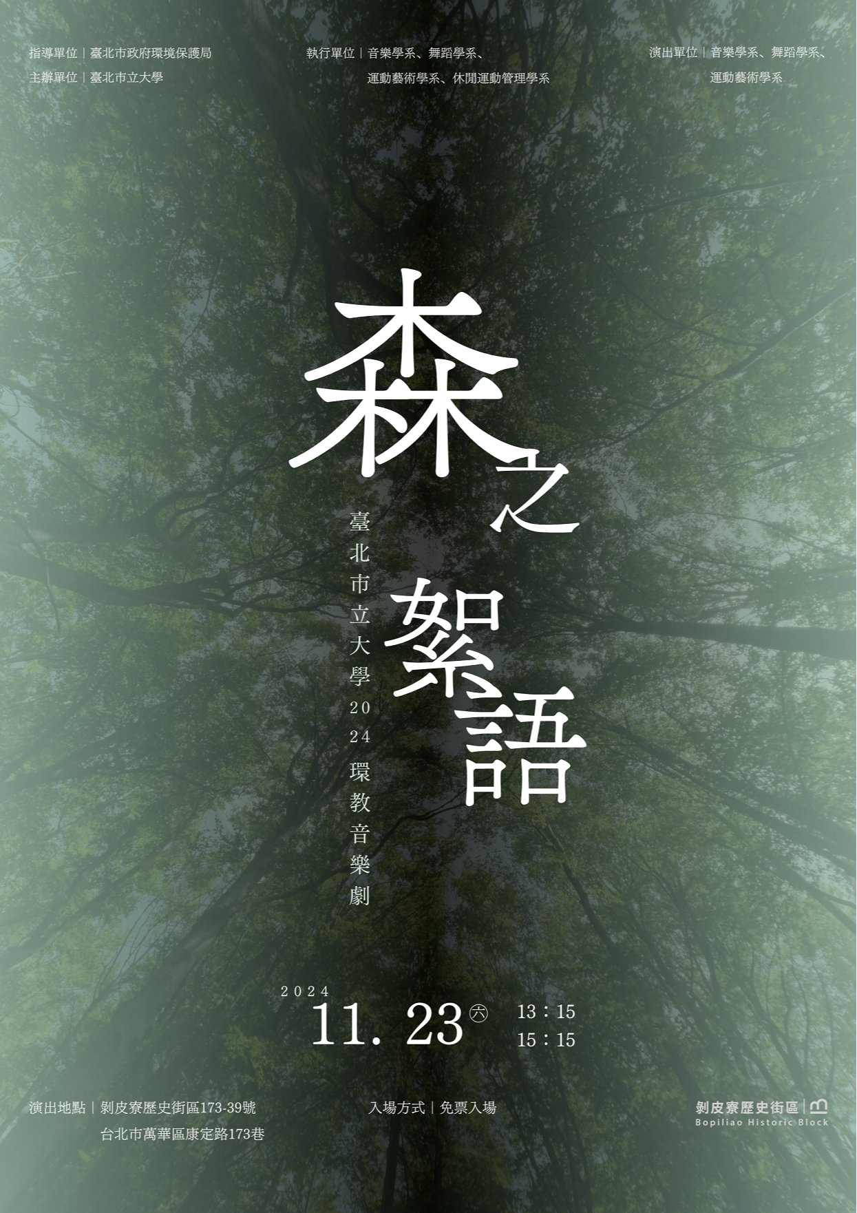 一、都市發展與綠色空間保存間的平衡是當代重要課題,由本校音樂學系、舞蹈學系、運動藝術學系及休閒運動管理學 系共同舉辦「環境教育-《森之絮語》音樂劇」展演,透 過音樂劇引導觀眾反思永續發展的重要性,持續為環境保護盡一份心力。為達教育及推廣目的,敬邀貴校師生一同 參與欣賞。
