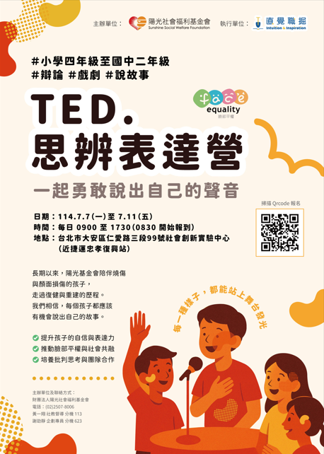 三、本營隊採共融設計,招收來自陽光與非陽光服務之不同背 景學生共30名,期盼透過混齡共學與平等交流,打造尊重 差異的學習場域。