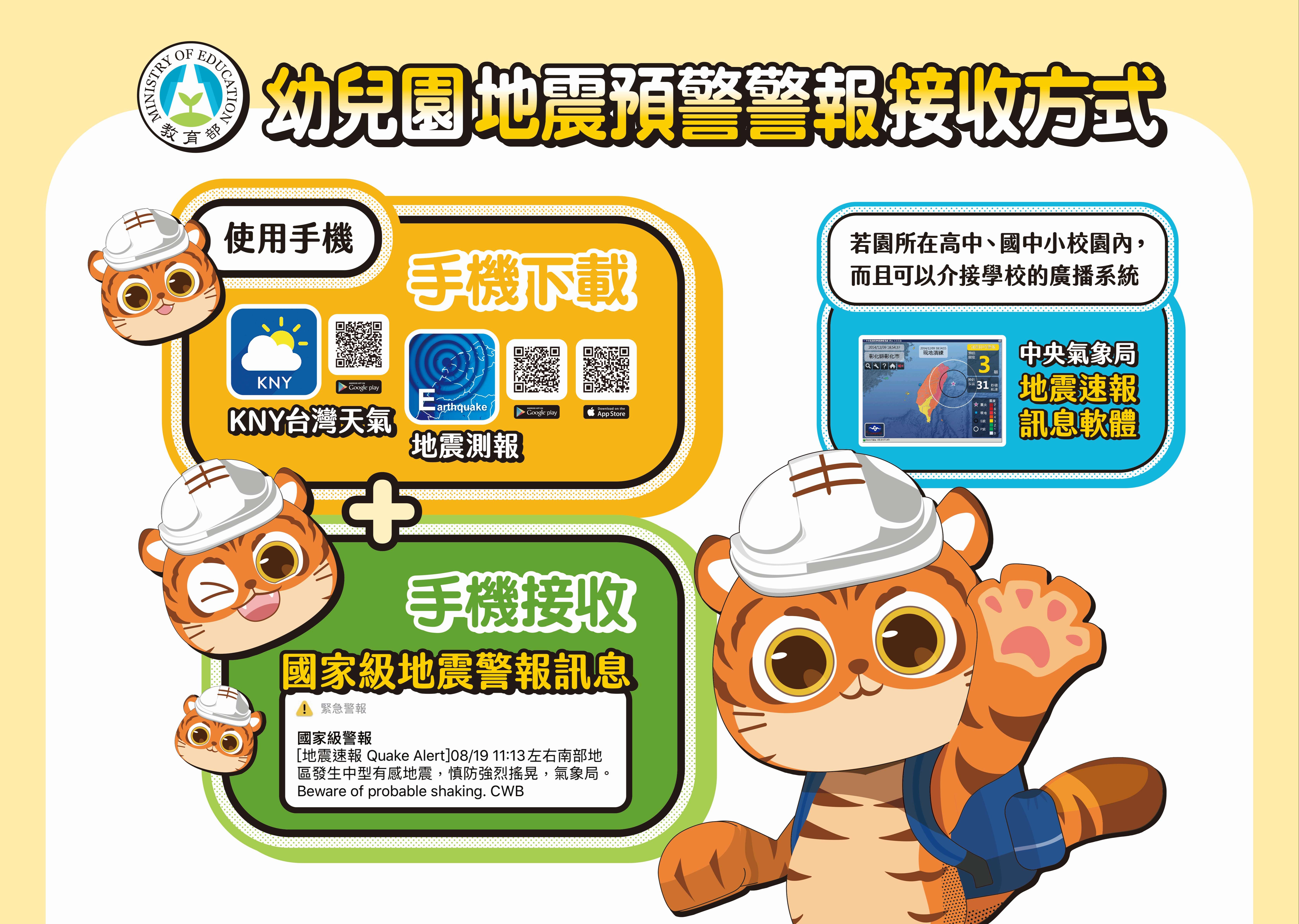 114年度國家防災日各級學校及幼兒園地震保命三步驟:「趴下、掩護、穩住」,並依學校地震避難掩護應變參考程序施行避難。